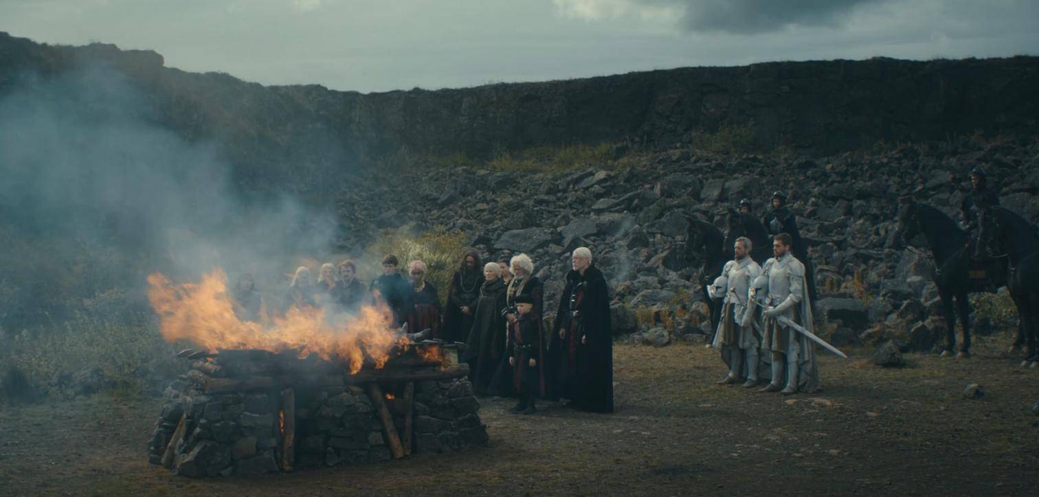 镜头一转,来到葬礼现场。一名御林铁卫因为战斗受伤没能到场。我觉得,贝勒的遗体按理应该送回君临火化才对,其实也没多远。闪回里我们都见过,就连受伤的骑士都能从红草原送回君临。我不明白,他们为什么这么急着就地火化王子。